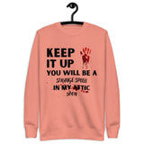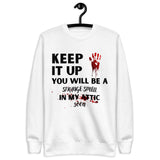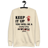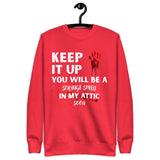 Bring dark humor to your wardrobe with our unisex sweatshirt featuring Keep It Up, You Will Be a Strange Smell in My Attic Soon. Soft, cozy, and bold in style.