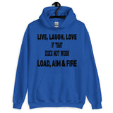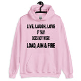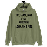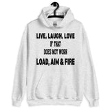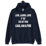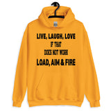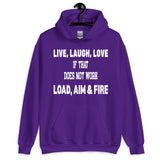 Dark humor meets cozy comfort — this unisex hoodie reads ‘Live Laugh Love — If That Doesn’t Work, Load Aim Fire.’ Perfect for anyone who prefers sarcasm over sentiment.