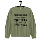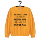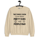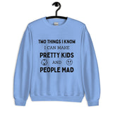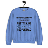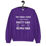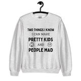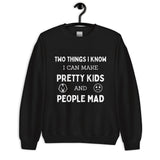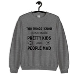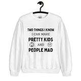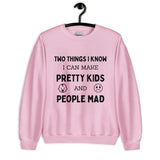 Own your confidence and your chaos with this bold, funny sweatshirt. “Two things I know: I can make pretty kids and people mad” is the perfect mix of bragging rights and attitude — a true crowd-pleaser for anyone who loves a little playful sass.