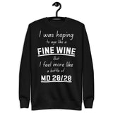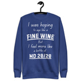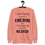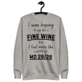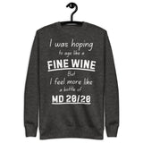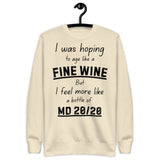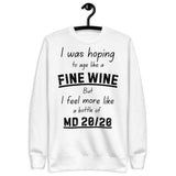 Stay cozy with a laugh in our unisex sweatshirt featuring I Was Hoping to Age Like a Fine Wine but I Feel More Like a Bottle of MD20/20. Soft, stylish, and perfect for humor lovers.