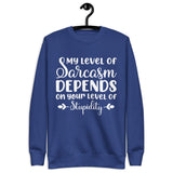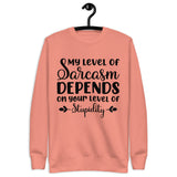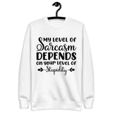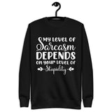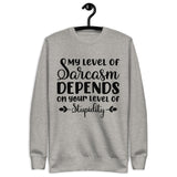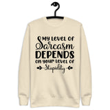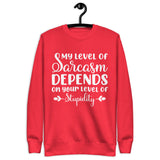 Stay comfy and witty with our unisex sweatshirt featuring My Level Of Sarcasm Depends On Your Level Of Stupidity. Perfect for humor lovers with attitude.