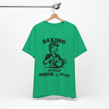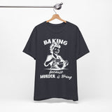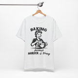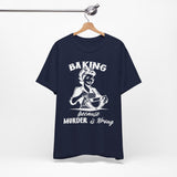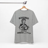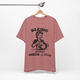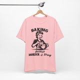 Baking because murder is wrong — this hilarious unisex tee is perfect for anyone who swaps rage for recipes. Soft, comfy, and ideal for bakers with a dark sense of humor.