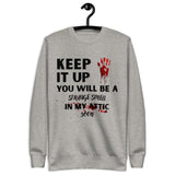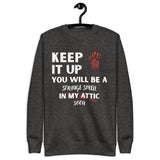 Bring dark humor to your wardrobe with our unisex sweatshirt featuring Keep It Up, You Will Be a Strange Smell in My Attic Soon. Soft, cozy, and bold in style.